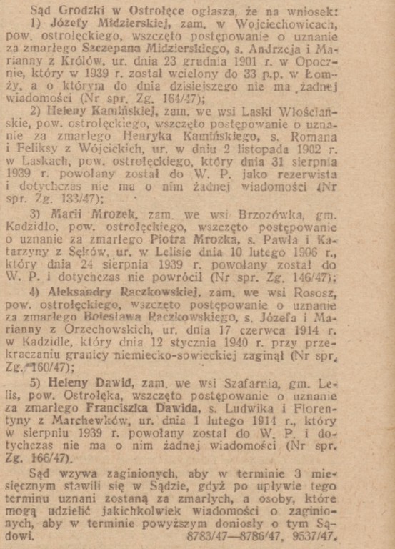 23 marca 1948 roku, a więc dokładnie 73 lata temu, ukazały się Obwieszczenia Publiczne - dodatek do Dziennika Urzędowego Ministerstwa Sprawiedliwości. Znalazły się w nim ogłoszenia Sądu Grodzkiego w Ostrołęce o poszukiwaniu pięciu osób z terenu naszego powiatu. Mieszkańcy Wojciechowic (dziś dzielnica Ostrołęki), Lasków Włościańskich (gm. Czerwin), Brzozówki (gm. Kadzidło), Rososzy (gm. Kadzidło) i Szafarni (gm. Lelis) zaginęli w 1939 lub 1940 roku, a więc na początku wojny.