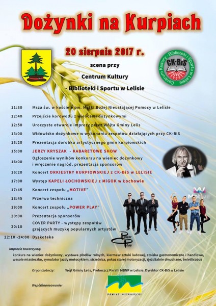 Dożynki rozpoczną się mszą świętą w kościele w Lelisie. Następnie korowód z wieńcami dożynkowymi przejdzie przed główną scenę, gdzie otwarcia imprezy dokona Stefan Prusik - wójt gminy Lelis. Następnie rozpoczną się już występy. Zagrają i rozbawią publikę m.in. Jerzy Kryszak z kabaretowym show, a także orkiestra kurpiowska z Lelisa, Kapela Łochowska i zespoły Motive oraz Power Play. Poniżej program dożynek.