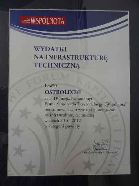 Ranking inwestycyjny „Wspólnoty” ogłoszony został już po raz dziesiąty. Tym razem wydatki w infrastrukturę techniczną obejmowały lata 2010- 2012. Wynik powiatu ostrołęckiego przedstawia się imponująco, czwarta lokata w rankingu, natomiast pierwsza w wydatkach bez dotacji inwestycyjnej. Tym samym w przeliczeniu na jednego mieszkańca naszego powiatu przypada 353, 19 zł., a bez dotacji 165,59 zł. Dla porównania, powiat lubelski, który w tym roku zajął pierwsze miejsce, wydatkował 449, 02 zł. w przeliczeniu na jednego mieszkańca, jednak bez dotacji inwestycyjnej jest to kwota zaledwie 62, 64 zł, tym samym z pierwszego spada na miejsce 85.