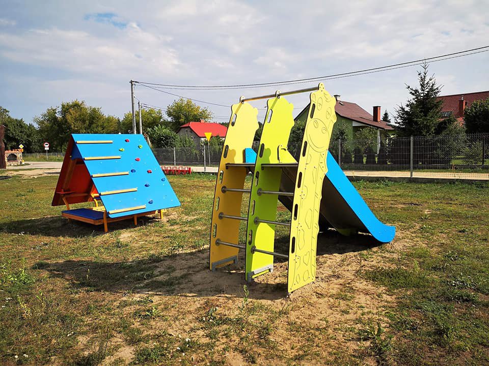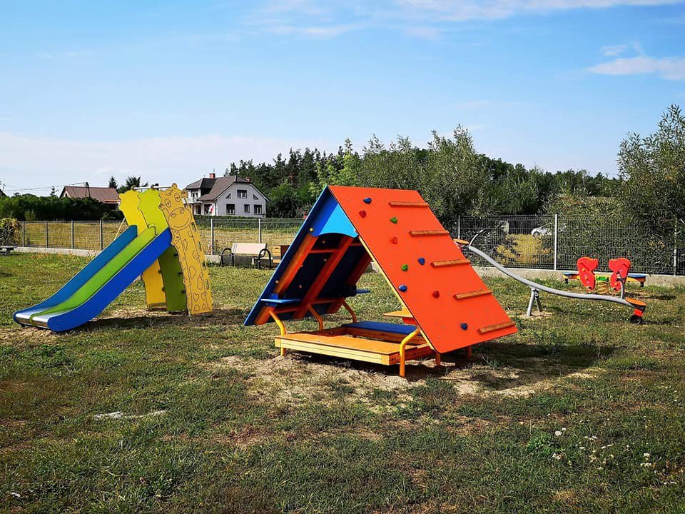 - plac zabaw wyposażony w: dwuosobowy bujak na sprężynie, dwutorową zjeżdżalnię, domek ze ściankami wspinaczkowymi i huśtawkę wagową (tzw. ważka),