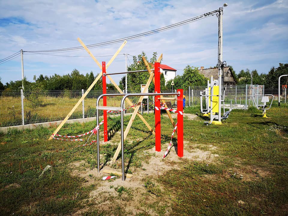 - siłownia zewnętrzna dla osób niepełnosprawnych wyposażona w rower do ćwiczenia rąk i nóg oraz sztangę do wyciskania.