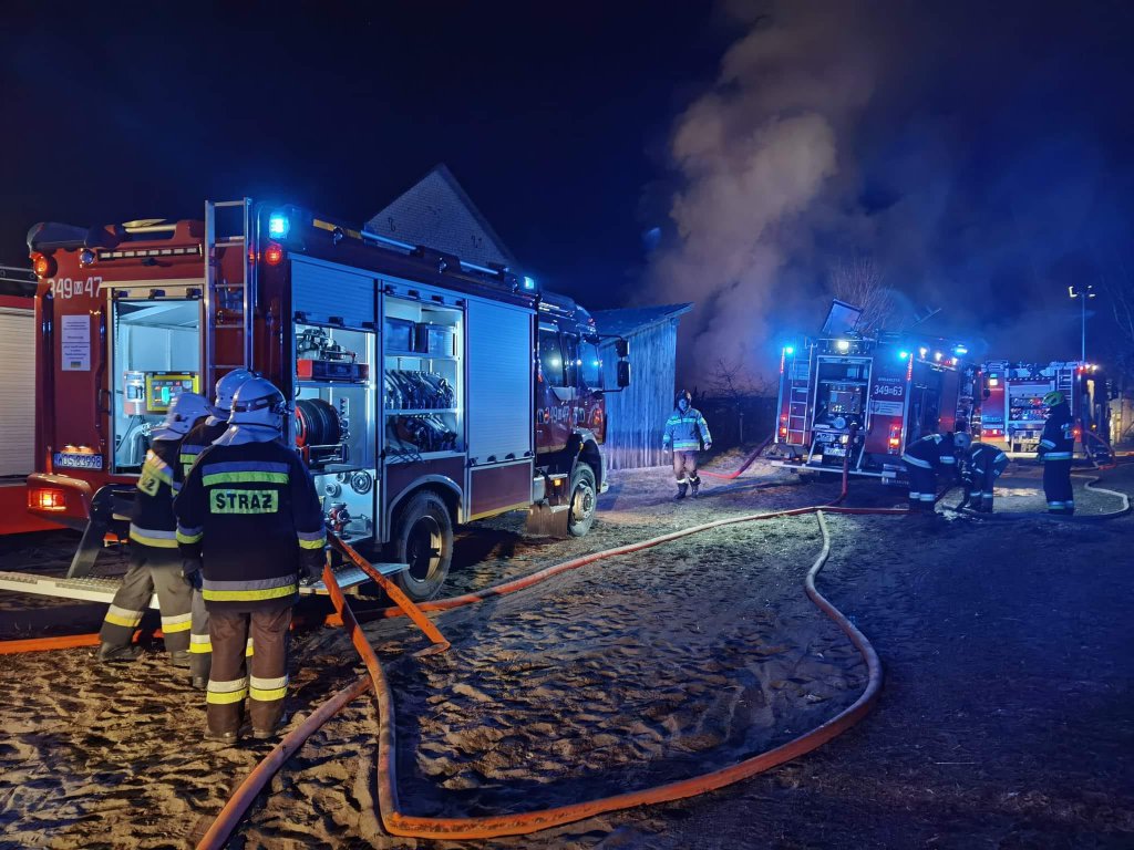 Podaliśmy cztery prądy wody na płonące budynki. W wyniku pożaru całkowicie spłonęła obora i część garażu. Straty oszacowano wstępnie na około 100 tysięcy złotych. Prawdopodobną przyczyną pożaru było zwarcie instalacji elektrycznej.