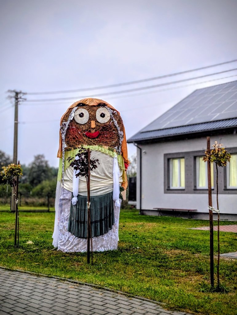 Dekoracja ma formę postaci uwieńczonej charakterystyczną głową z dużymi, okrągłymi oczami. Twórcy użyli różnorodnych materiałów, które nadają całości żywego charakteru. Kukła została ustawiona na trawniku przed budynkiem OSP, gdzie doskonale komponuje się z otoczeniem. I przyciąga uwagę!