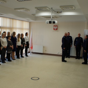 Po zakończeniu części oficjalnej była okazja do złożenia życzeń od funkcjonariuszy wszystkim zebranym na sali pracownikom cywilnym pracownikom policji, dla których przygotowano słodką niespodziankę.