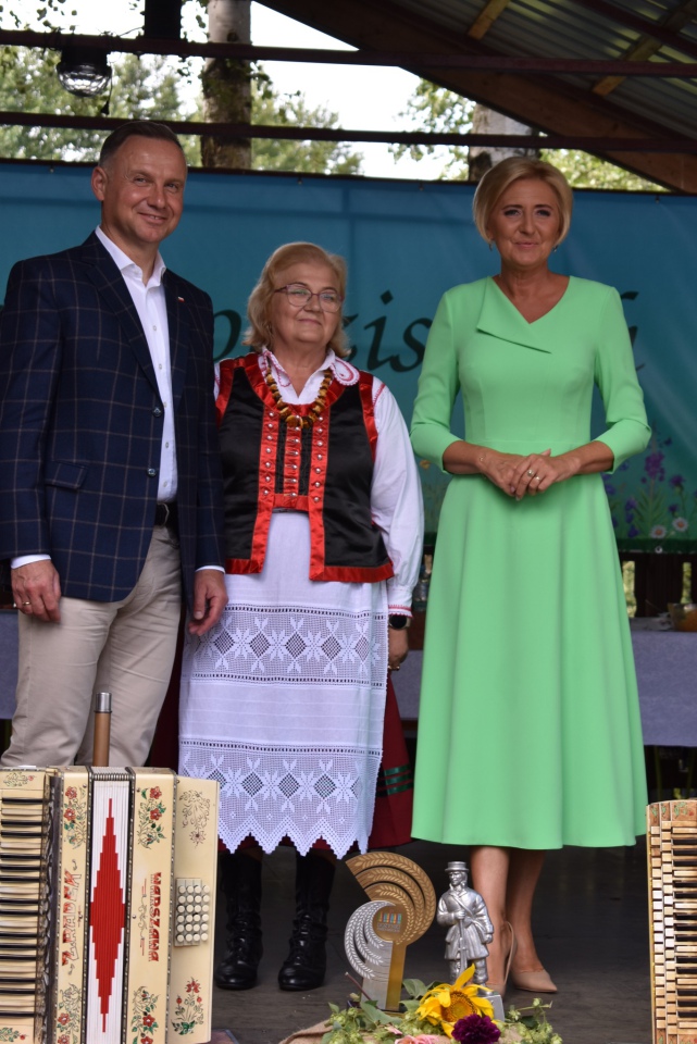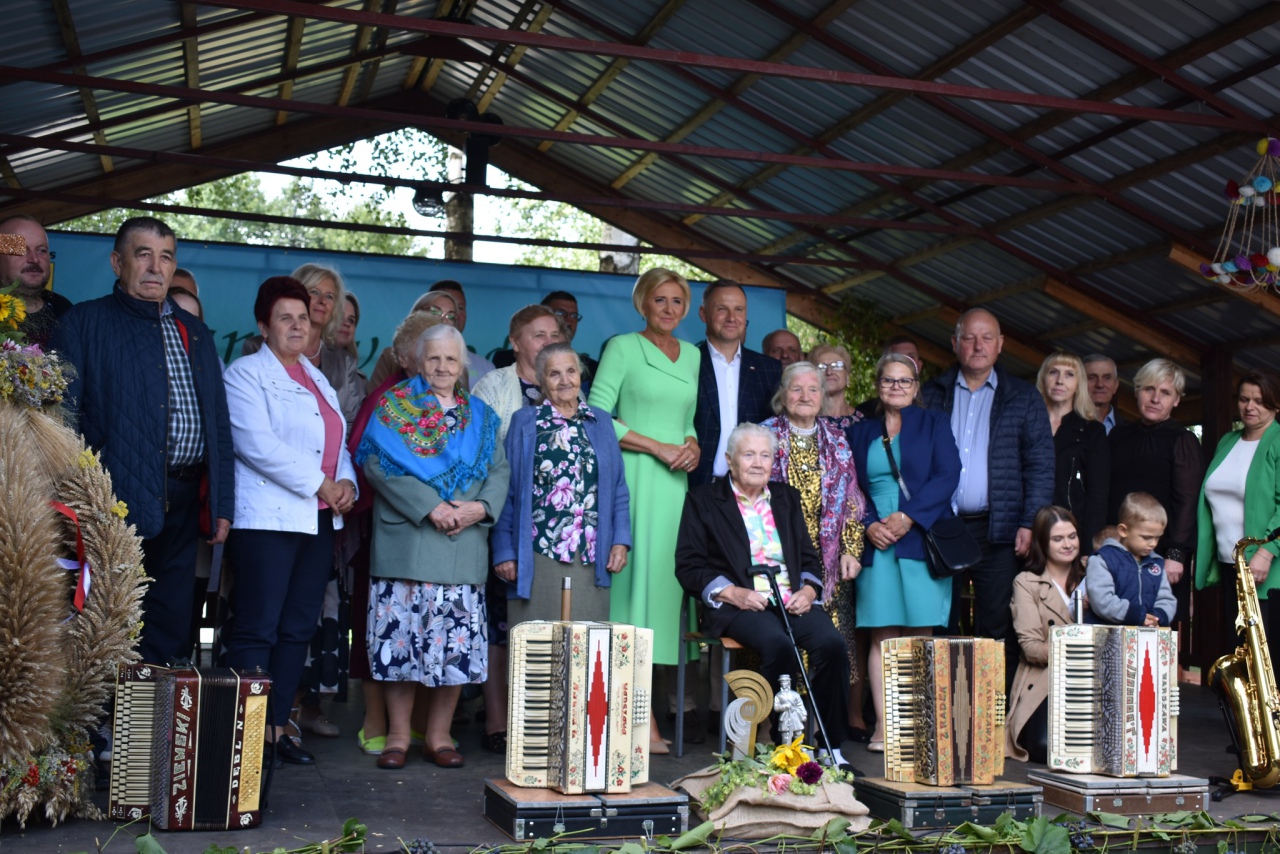 Łodziska (gmina Lelis) - Prezydent Rzeczypospolitej Polskiej Andrzej Duda wraz z małżonką Agatą Kornhauser-Dudą odwiedzili dziś Koło Gospodyń Wiejskich Zagajnica w Łodziskach. Przybyli, aby podziękować gospodyniom za wykonanie najpiękniejszego wieńca dożynkowego w Polsce, który zdobył główną nagrodę podczas Dożynek Prezydenckich w 2022 roku.