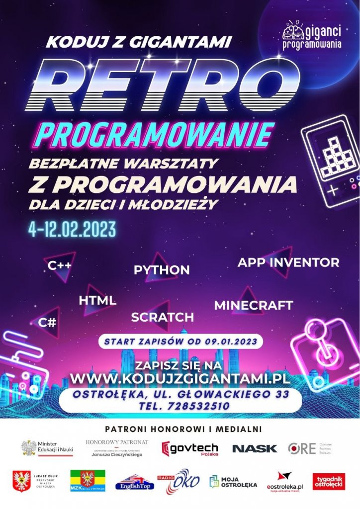 Po półrocznej przerwie powraca największe programistyczne wydarzenie dla dzieci i młodzieży. Już w lutym odbędzie się kolejna edycja “Koduj z Gigantami”, czyli bezpłatnej akcji edukacyjnej, która obejmie całą Polskę! W trakcie warsztatów uczestnicy nauczą się podstaw programowania, a przy tym poznają gry z czasów młodości swoich rodziców. Wydarzenie wspierają MEN, GovTech, Janusz Cieszyński Sekretarz Stanu w KPRM ds. Cyfryzacji, NASK i ORE oraz Prezydent Miasta Ostrołęki Łukasz Kulik i Miejski Zakład Komunikacji Sp. z o.o. w Ostrołęce