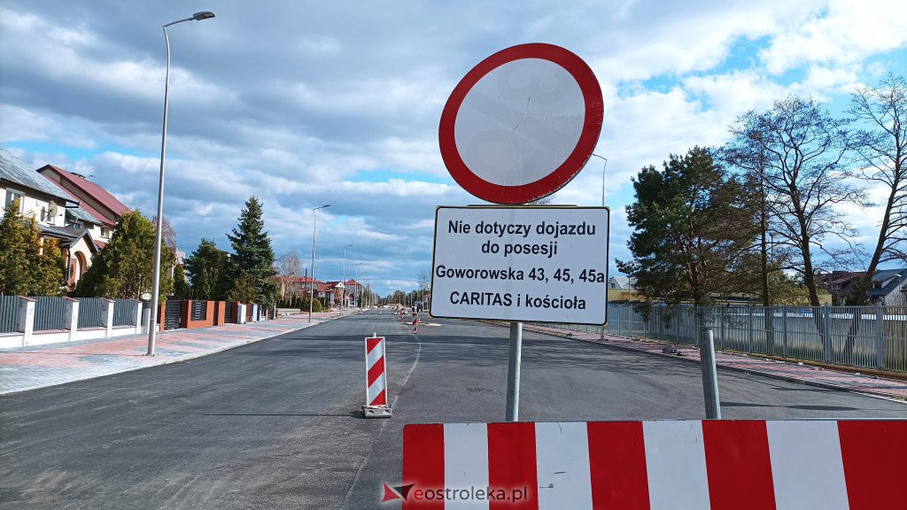 Pod koniec tygodnia na ulicy Goworowskiej wyłożono już ostatnią, ścieralną warstwę asfaltu. Przebudowana ulica wraz z nowym rondem nie jest jednak przejezdna, ponieważ konieczne jest wykonanie niezbędnego oznakowania, lecz żeby to zrobić, wykonawca inwestycji musi odczekać 14 dni. Do zrobienia zostało jeszcze oświetlenie uliczne.