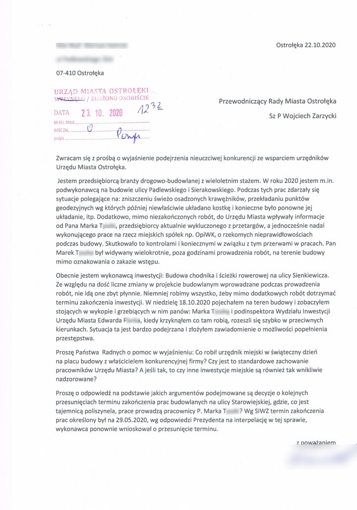 Autor pisma jest podwykonawcą na tej inwestycji i wskazuje, że już wcześniej systematycznie miało dochodzić do aktów wandalizmu na terenie budowy. Wskazał też z imienia i nazwiska osobę, która miała pojawiać się na budowie. Piszący list twierdzi, że to Marek T. - biznesmen z branży budowlanej, który w 2018 roku otrzymał pełnomocnictwo od prezydenta Ostrołęki Łukasza Kulika i na jego podstawie miał prawo m.in. do wglądu w dokumentację dotyczącą inwestycji.