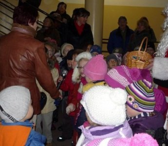 Maluchy witał św. Mikołaj z koszem pełnym cukierków i workiem prezentów. Dzieci wierszem i piosenką wprowadziły zgromadzonych w magię nadchodzących świąt. Następnie przedszkolaki przystroiły choinkę własnoręcznie wykonanymi zabawkami.