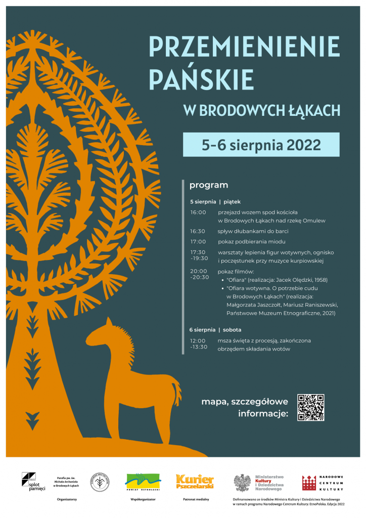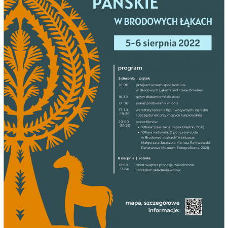 Fundacja Splot Pamięci, Kurpiowskie Bractwo Bartne oraz Parafia pw. Świętego Michała Archanioła w Brodowych Łąkach zapraszają do udziału w corocznych obchodach Święta Przemienienia Pańskiego. W piątek 5 sierpnia - dzień przed właściwym świętem - będzie można wziąć udział m.in. w warsztatach lepienia woskowych figur wotywnych, przyjrzeć się procesowi podbierania miodu z barci oraz obejrzeć dwa filmy poświęcone historii i współczesnemu trwaniu lokalnego zwyczaju składania ofiar wotywnych.