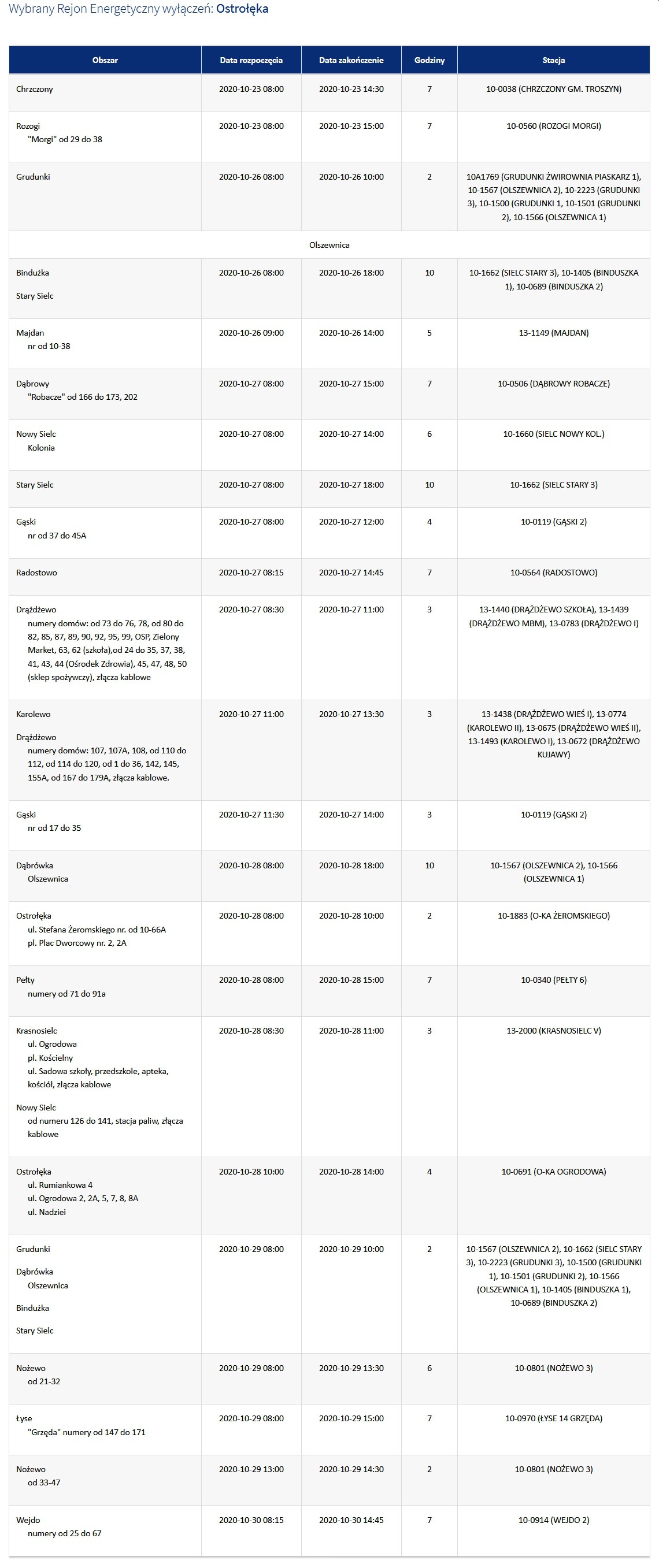 Przerwy w dostawie prądu spowodowane będą pracami konserwacyjnymi zaplanowanymi na najbliższy tydzień przez Rejon Energetyczny w Ostrołęce. Poniżej publikujemy szczegółowy harmonogram zaplanowanych wyłączeń. Dowiecie się z niego kiedy dokładnie, jak długo i gdzie prowadzone będą prace.