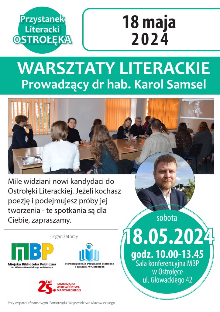 - Warsztaty literackie poprowadzi dr hab. Karol Samsel. To doskonała okazja dla osób, które kochają poezję i chcą doskonalić swoje umiejętności pisarskie. Warsztaty są otwarte dla wszystkich, bez względu na doświadczenie.