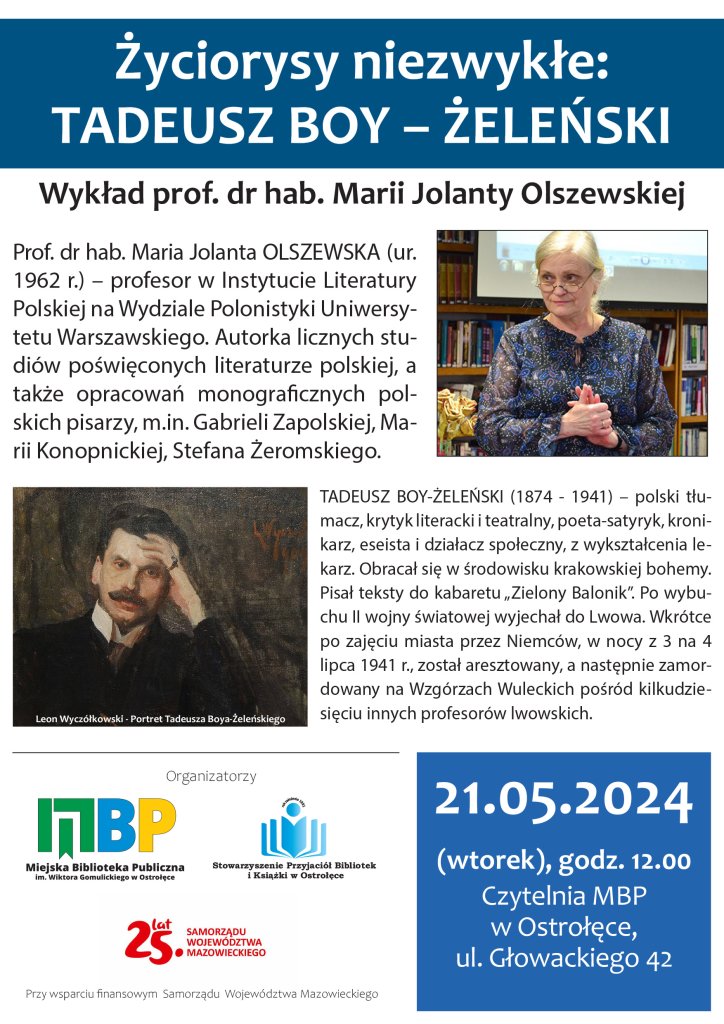 - Wykład "Życiorysy niezwykłe: TADEUSZ BOY – ŻELEŃSKI" wygłosi prof. dr hab. Maria Jolanta Olszewska. Wykład poświęcony będzie życiu i twórczości tego wybitnego polskiego pisarza, tłumacza i krytyka literackiego.