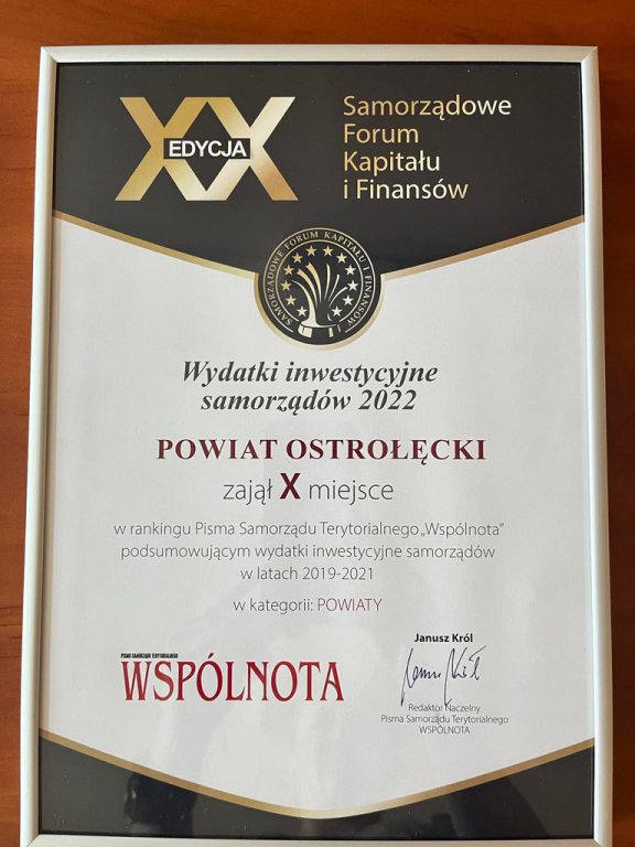Pismo Samorządu Terytorialnego “Wspólnota” ogłosiło ranking inwestycji samorządowych za lata 2019 - 2021. Powiat ostrołęcki uplasował się w pierwszej dziesiątce, miasto Ostrołęka w swojej kategorii zajęło miejsce 45 na 47 ujętych w rankingu.