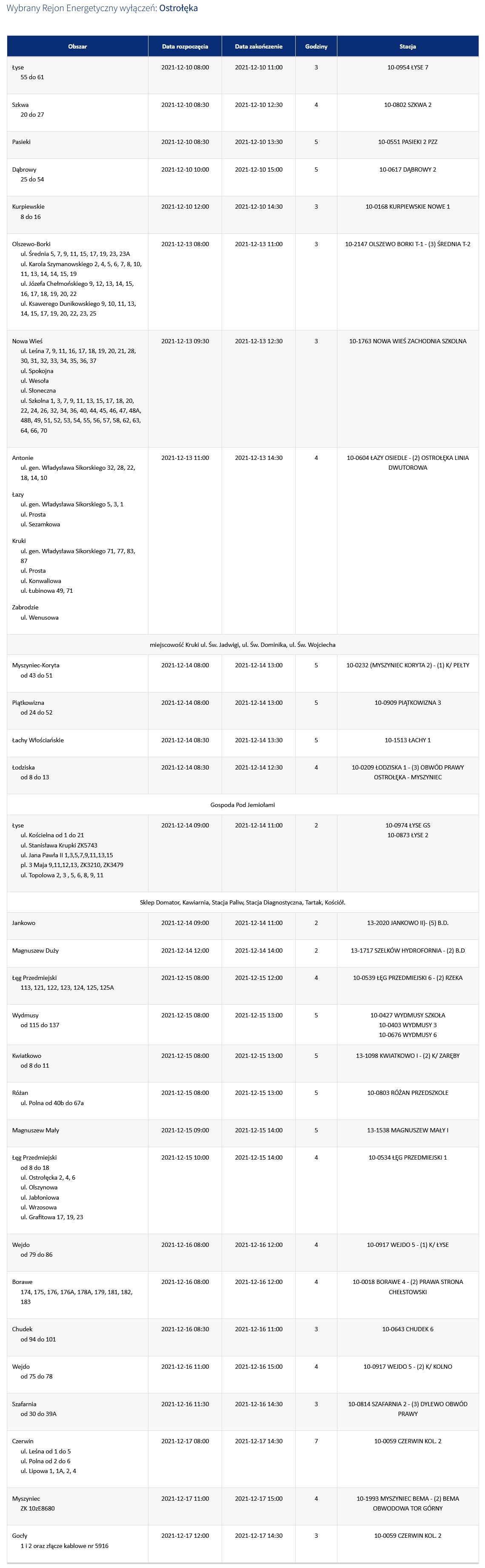 Szczegółowy harmonogram wyłączeń w dniach od 10 do 17 grudnia publikujemy poniżej: