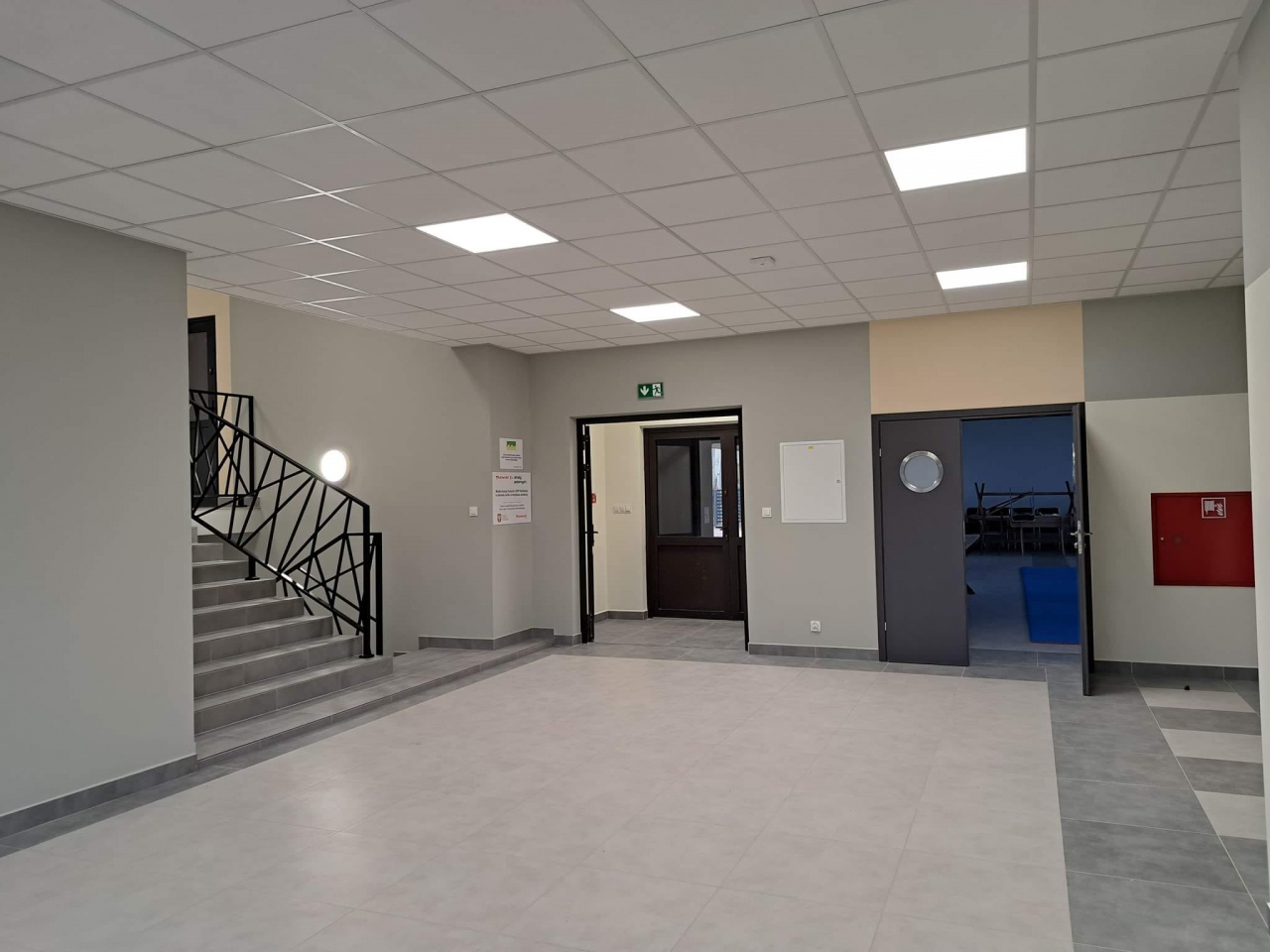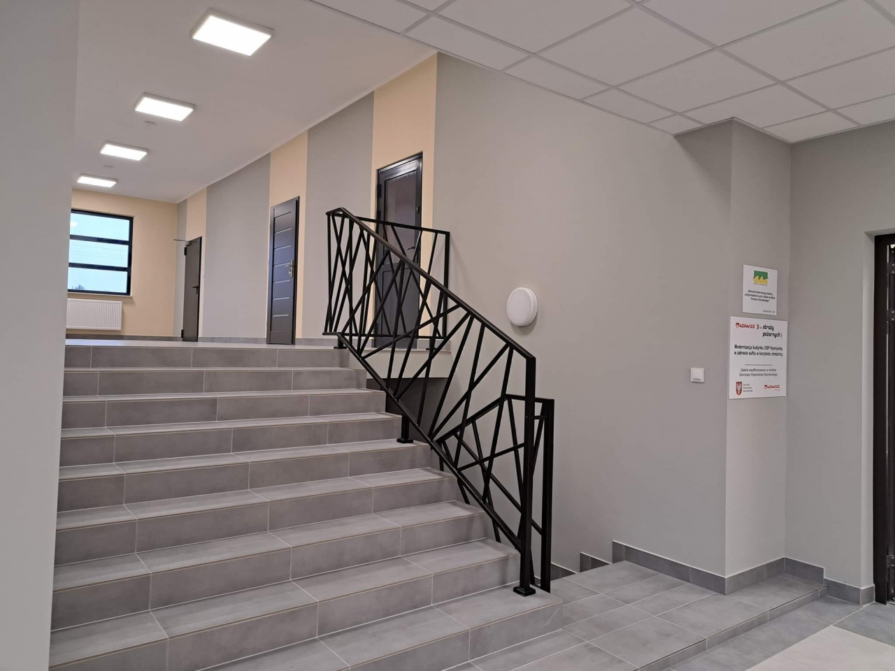 Inwestycja objęła m.in. wykonanie sufitu podwieszanego, zamontowano też lampy oświetleniowe, wyrównano posadzki. Nie zabrakło szpachlowania ubytków oraz gruntowania ścian, powiększono otwory drzwiowe. Ponadto ułożono płytki gresowe w kolorze jasnoszarym (korytarz i schody), pomalowano ściany, zamontowano drzwi płytowe w kolorze antracyt wraz z ościeżnicami regulowanymi. Pojawiła się również nowa balustrada stalowa w kolorze czarnym o wysokości 1,1 m.