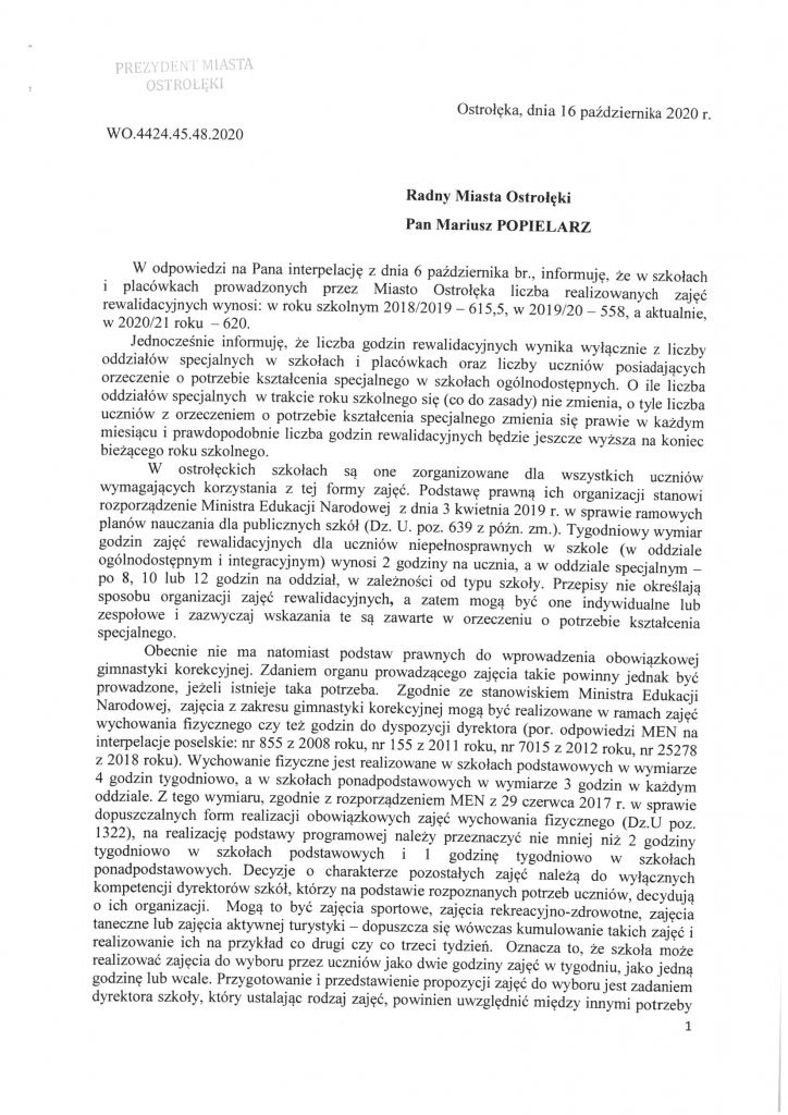 Prezydent Ostrołęki odpowiedział radnemu Mariuszowi Popielarzowi na pytania dotyczące ostrołęckiej oświaty, a konkretnie - zajęć rewalidacyjnych i zajęć korekcyjnych wady postawy.