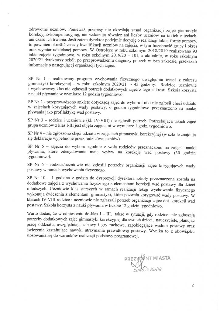 Nadeszła już odpowiedź prezydenta miasta. Łukasz Kulik wskazał liczbę godzin zajęć rewalidacyjnych i doprecyzował, że wynika ona wyłącznie z liczby oddziałów specjalnych oraz liczby uczniów posiadających orzeczenie o potrzebie kształcenia specjalnego. Z kolei odnosząc się do gimnastyki korekcyjnej, zaznaczył, że nie ma podstaw prawnych do wprowadzenia obowiązkowych zajęć w tym zakresie. Poinformował także, jaką decyzję co do organizacji takich zajęć podjęli dyrektorzy szkół: