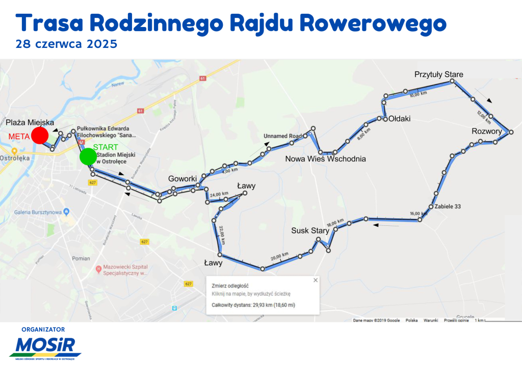 Na uczestników rajdu czeka malownicza, około 30-kilometrowa trasa, która pozwoli odkryć urokliwe zakątki regionu. Start zaplanowano na godzinę 10:00 ze stadionu przy ulicy Witosa 1 w Ostrołęce. Fani jednośladów wyruszą w kierunku gminy Rzekuń, a trasa przebiegać będzie przez Ostrołękę, Nową Wieś Wschodnią, Przytuły Stare, Rozwory, Zabiele, Susk Stary, Ławy i Goworki. Wielki finał rajdu przewidziano na plaży miejskiej w Ostrołęce, gdzie na wszystkich uczestników czekać będą zasłużone atrakcje.
