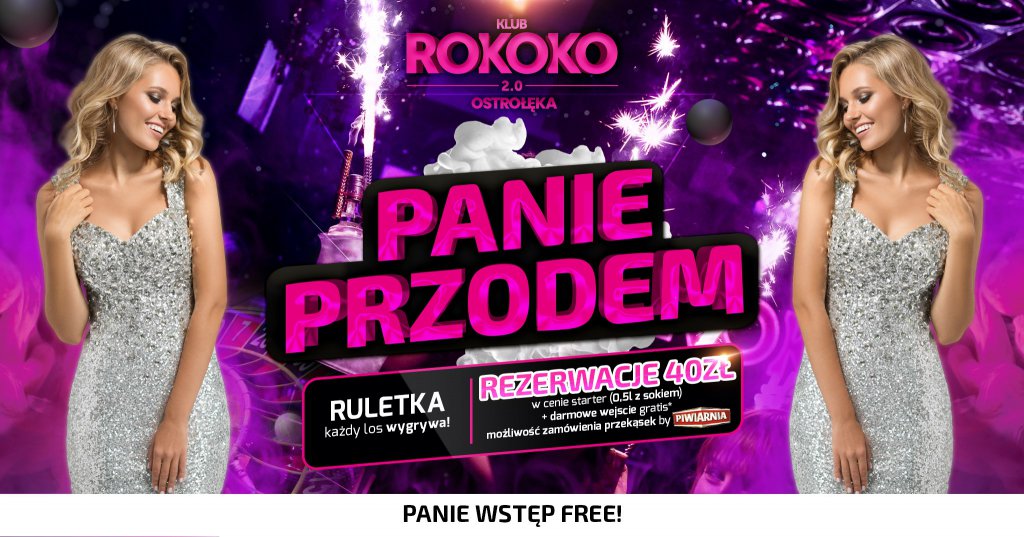 Klub Rokoko 2.0 Ostrołęka zaprasza na kolejną imprezę! Po ostatnich dwóch tygodniach wzięliśmy pod uwagę Wasze sugestie i otwieramy obie sale! Tym samym do Rokoko powraca cykl Panie Przodem, a to oznacza, że Panie wchodzą za darmo do 23:15