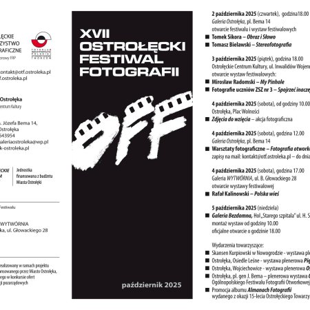 Sobota, 4 października: Dzień rozpocznie się akcją plenerową „Zdjęcia do wzięcia” na Placu Wolności (godz. 10:00). O godzinie 12:00 w Galerii Ostrołęka odbędą się warsztaty fotografii otworkowej (zapisy do 2 października pod adresem: kontakt@off.ostroleka.pl). Wieczorem, o 17:00, w Galerii WYTWÓRNIA (ul. Głowackiego 28) zostanie otwarta wystawa Rafała Kalinowskiego „Polska wieś”.