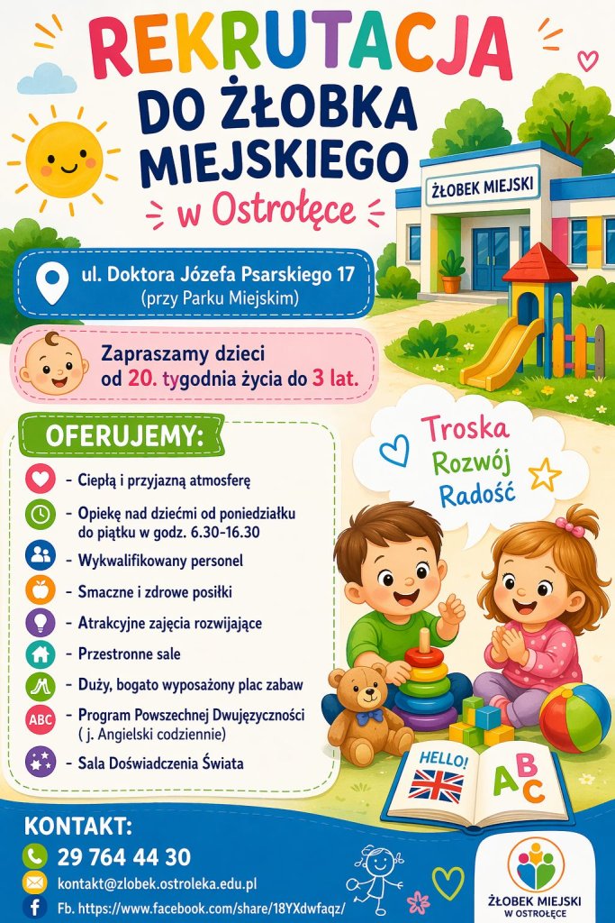 Rodzice dzieci w wieku od 20. tygodnia życia do 3 lat mogą składać wnioski o przyjęcie swoich pociech do Żłobka Miejskiego w Ostrołęce na rok szkolny 2026/2027. Zapisy ruszyły 20 kwietnia.