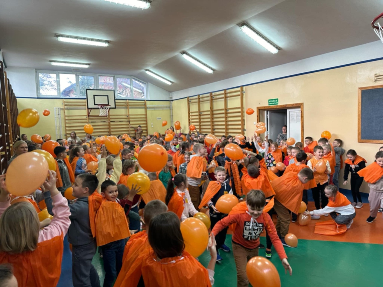 Podczas dzisiejszego podsumowania kampanii wszyscy uczniowie założyli ubrania w kolorze pomarańczowym, a spotkania przeprowadzone zostały w dwóch grupach: dla klas 1-3 oraz 4-8, aby omówić wszystkie aktywności zrealizowane podczas trwania kampanii.
