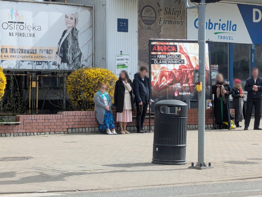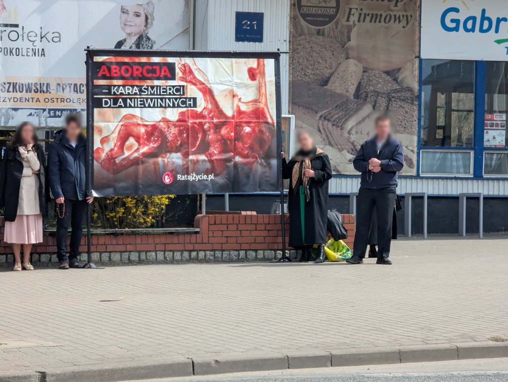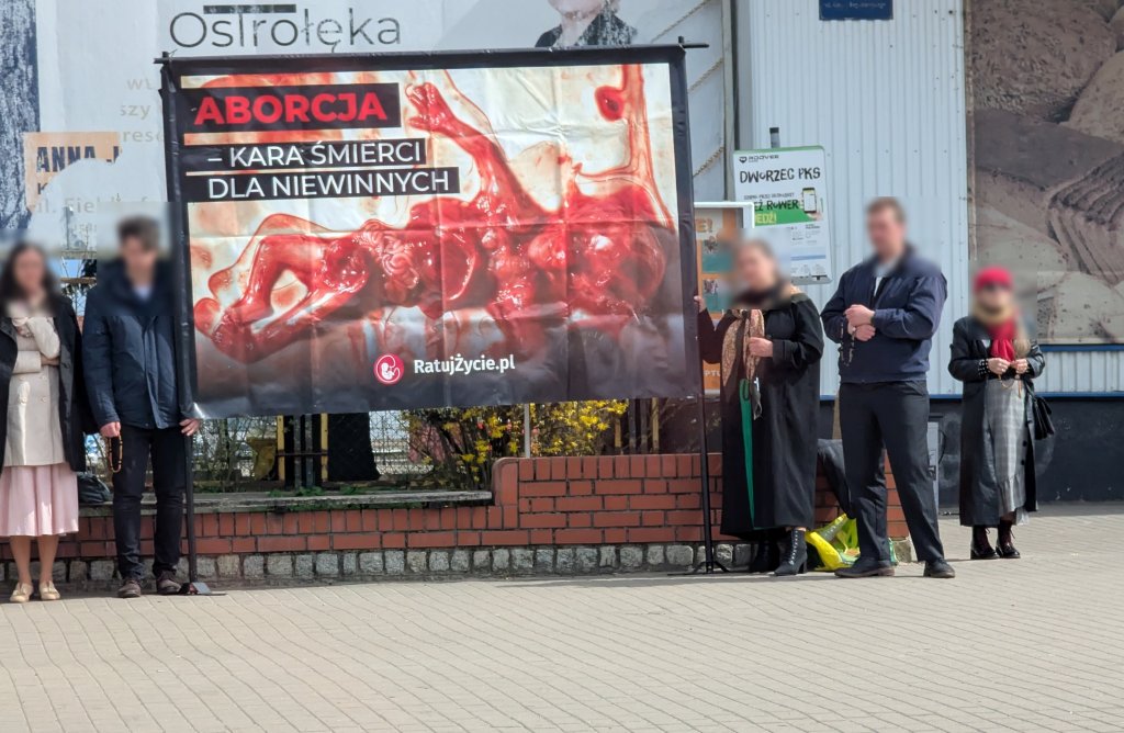 Publiczny różaniec o zatrzymanie aborcji nie po raz pierwszy odbywa się w Ostrołęce i zawsze wygląda podobnie. W reprezentacyjnym miejscu miasta, w tym przypadku - przed dworcem autobusowym - zbierają się ludzie z nagłośnieniem i plakatami, na których są zdjęcia dzieci po aborcji.