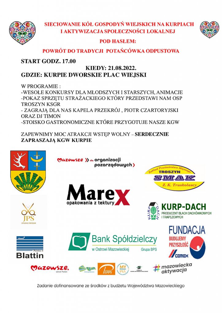 Koła Gospodyń Wiejskich w Kurpiach Szlacheckich i Dworskich zapraszają na wydarzenie. Sieciowanie Kół Gospodyń Wiejskich na Kurpiach i aktywizacja społeczności lokalnej pod hasłem Powrót do Tradycji Potańcówka Odpustowa. Wydarzenie odbędzie się 21.08.2022. Od godziny 17:00 na placu wiejskim w Kurpuch Dworskich.
