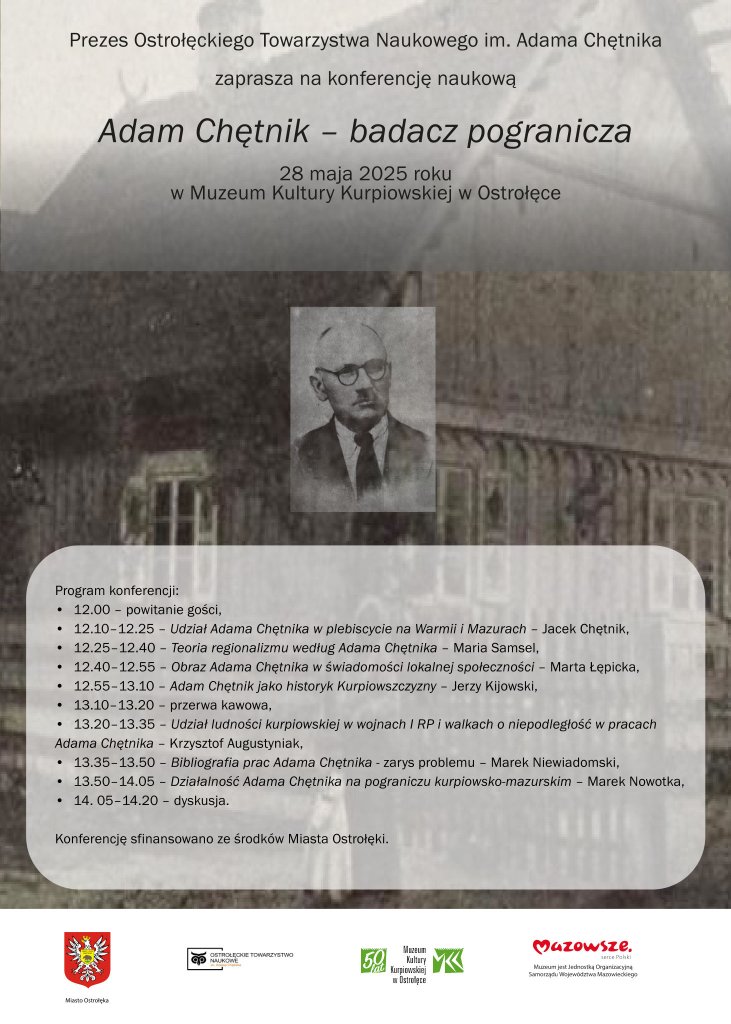 Wydarzenie odbędzie się 28 maja 2025 roku w Muzeum Kultury Kurpiowskiej w Ostrołęce (Plac gen. Józefa Bema 8). Start o godz. 12:00. Konferencja zatytułowana „Adam Chętnik – badacz pogranicza” zgromadzi grono znanych regionalistów i badaczy, którzy przybliżą różnorodne aspekty działalności Chętnika – od jego udziału w plebiscycie na Warmii i Mazurach, przez teorię regionalizmu, po dokumentowanie udziału Kurpiów w historii Polski.