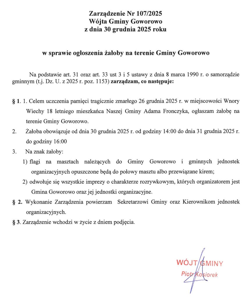 W gminie Goworowo, z której pochodził tragicznie zmarły w Boże Narodzenie 18-letni Adam Fronczyk, ogłoszono żałobę. Władze gminy wprowadziły ją od wtorku od 14:00 do środy do 16:00. Ostatniego dnia 2025 roku odbędą się uroczystości pogrzebowe Adama.