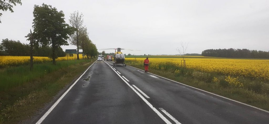 Do wypadku doszło w środę, 17 maja przed godziną 11:00 na drodze krajowej nr 57 w miejscowości Dzierżanowo (powiat makowski). Do akcji ratunkowej zadysponowano kilka jednostek strażackich, niezbędna była także pomoc śmigłowca LPR.