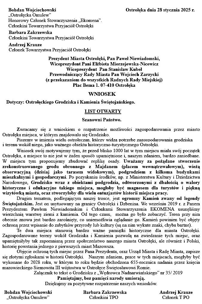 Autorzy zwracają się do prezydenta miasta Pawła Niewiadomskiego oraz władz samorządowych o rozpatrzenie możliwości zagospodarowania terenu dawnego Grodziska. W swoim wniosku podkreślają historyczne znaczenie tego miejsca, przypominając, że prawie 1000 lat temu właśnie tam miała swój początek Ostrołęka.