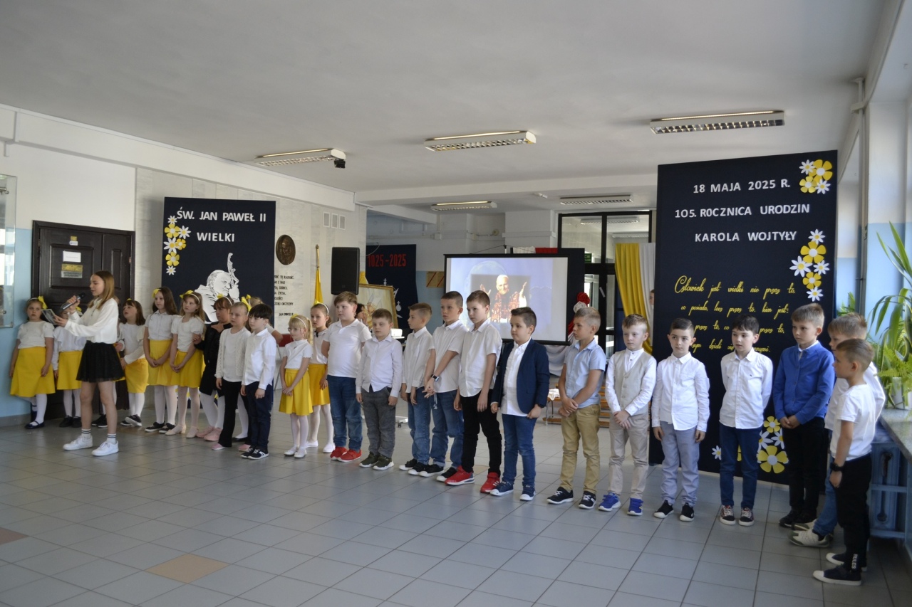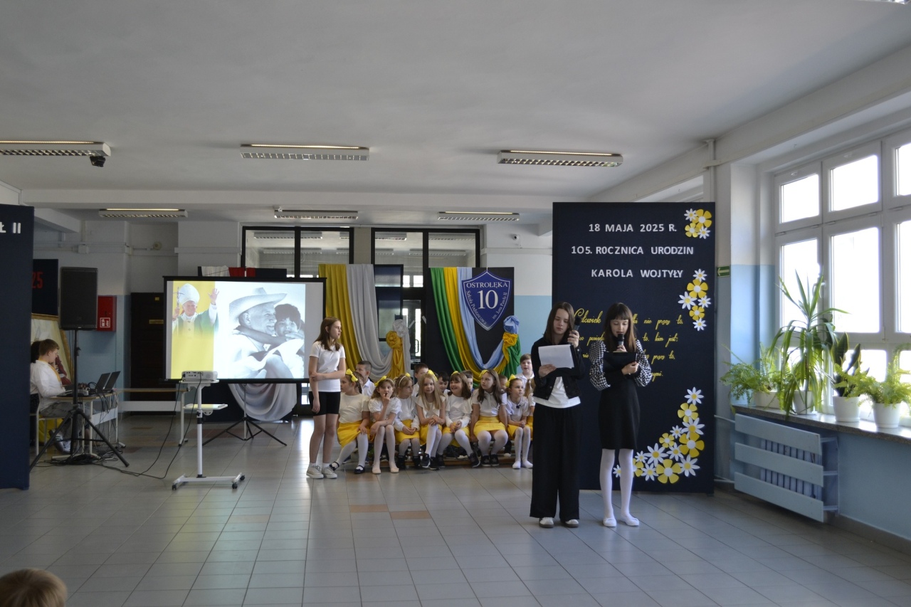 We wtorek, 20 maja, cała społeczność Szkoły Podstawowej nr 10 im. św. Jana Pawła II w Ostrołęce wzięła udział w wyjątkowej uroczystości – akademii z okazji 105. rocznicy urodzin patrona szkoły. Choć dzień urodzin Karola Wojtyły przypada na 18 maja, to właśnie w poniedziałek uczniowie, nauczyciele, pracownicy administracyjni oraz dyrekcja zgromadzili się, by wspólnie uczcić pamięć o Papieżu Polaku.