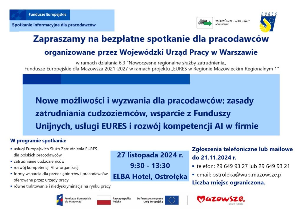 Wojewódzki Urząd Pracy w Warszawie zaprasza wszystkich pracodawców na bezpłatne spotkanie informacyjne. Wydarzenie odbędzie się 27 listopada w hotelu ELBA w Ostrołęce, w godzinach 9:30-13:30.