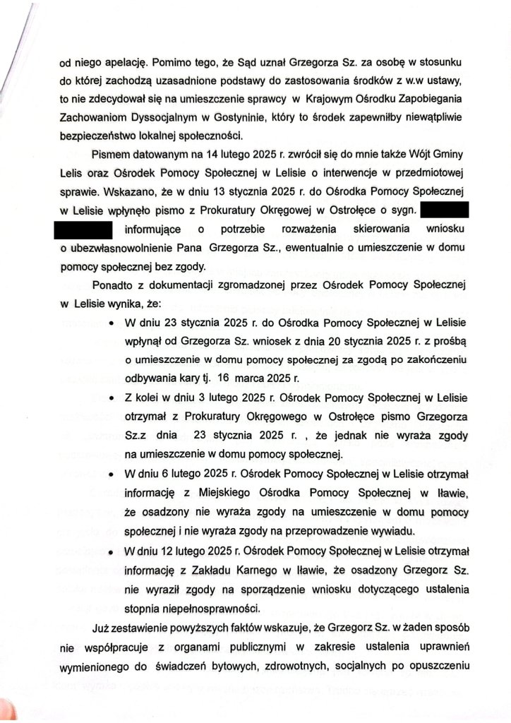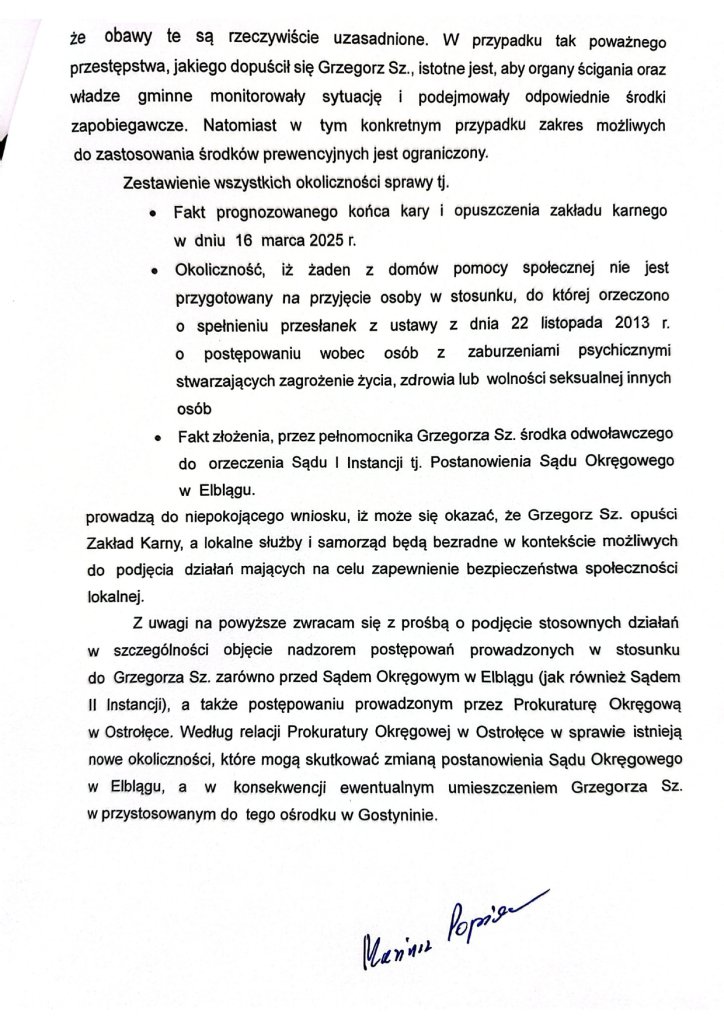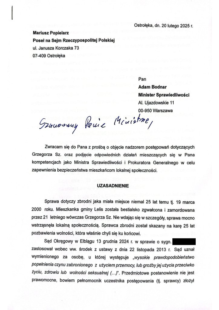 W piśmie do ministra Bodnara poseł pisze, że Grzegorz Sz. "w żaden sposób nie współpracuje z organami publicznymi w zakresie ustalenia uprawnień wymienionego do świadczeń bytowych, zdrowotnych, socjalnych po opuszczeniu zakładu karnego". - Pośrednio może to również wskazywać na jego ignorancką postawę do całego systemu prawnego - dodaje Popielarz. Poseł pisze też o obawach mieszkańców, jak również o tym, że zdaniem ostrołęckiej prokuratury "w sprawie istnieją nowe okoliczności, które mogą skutkować zmianą postanowienia Sądu Okręgowego w Elblągu, a w konsekwencji ewentualnym umieszczeniem Grzegorza Sz. w przystosowanym do tego ośrodku w Gostyninie". Poniżej pismo, jakie trafiło do ministra.
