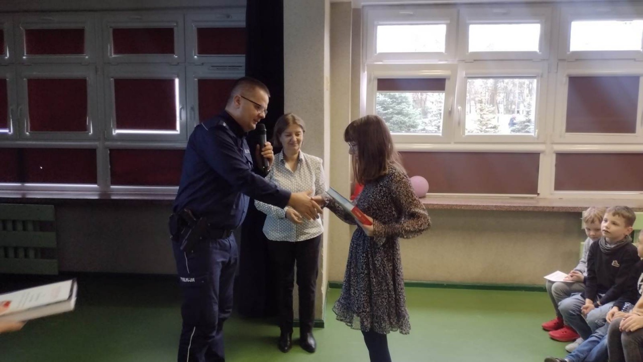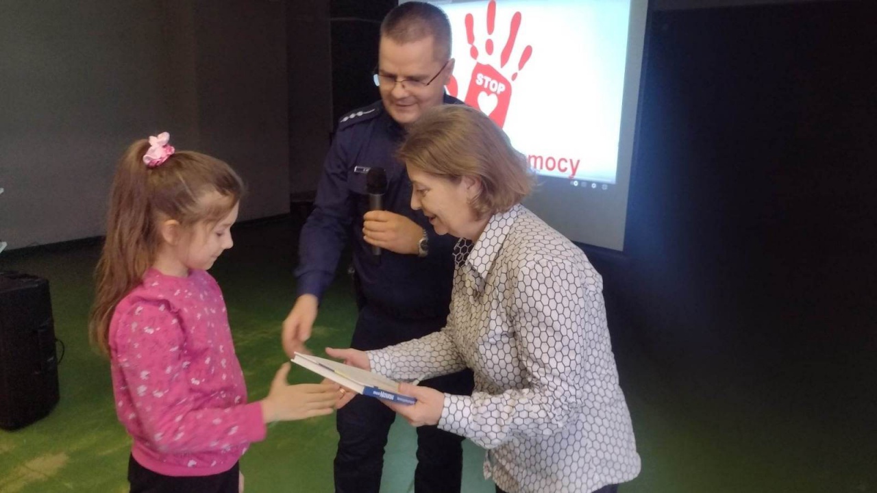Podczas spotkania odbyło się również uroczyste wręczenie dyplomów i nagród książkowych laureatom szkolnego konkursu "Stop Przemocy i Agresji w Szkole", którego dokonała wicedyrektor Hanna Kolbus wraz z st. asp. Krzysztofem Kolatorem.