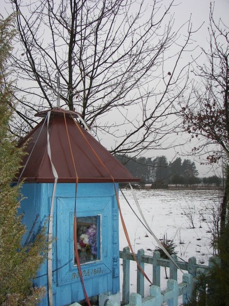 Kapliczka wykonana została w kurpiowskim stylu. Wg napisu pochodzi z 1863 roku. A jej istnienie wzbudziło nie lada sensację, ze względu na to, że większość tego typu miejsc, powstawała dopiero po I wojnie światowej, kiedy to Polska odzyskała niepodległość, dlatego że, wcześniejsze próby stawiania obiektów kończyły się ich dewastacją przez władze carskie.
