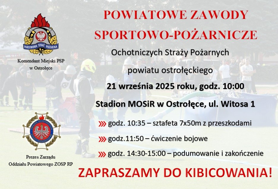 Ostrołęka przygotowuje się na wielkie sportowe emocje! Już 21 września 2025 roku na Stadionie MOSiR przy ul. Witosa 1 odbędą się powiatowe zawody sportowo-pożarnicze Ochotniczych Straży Pożarnych powiatu ostrołęckiego.