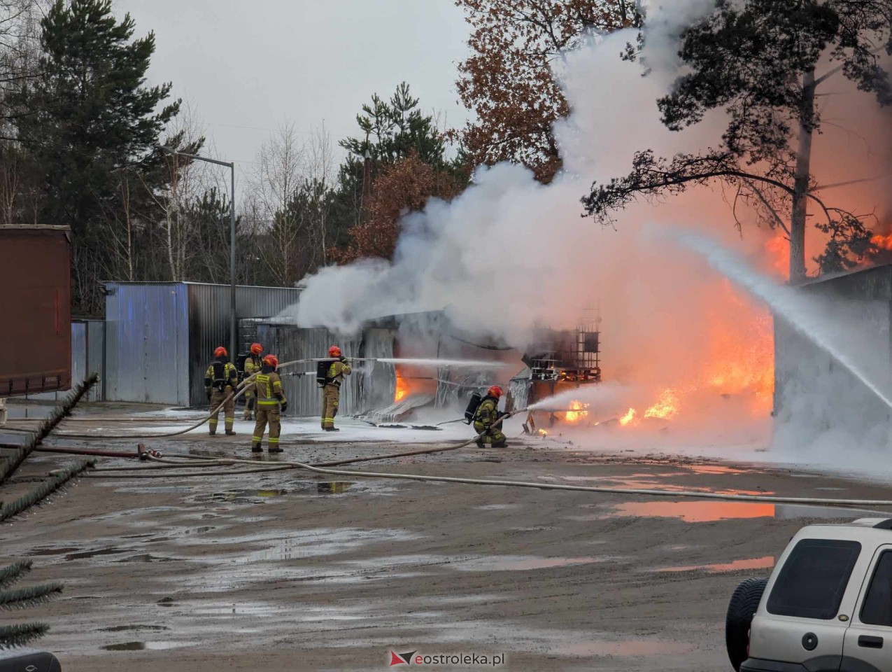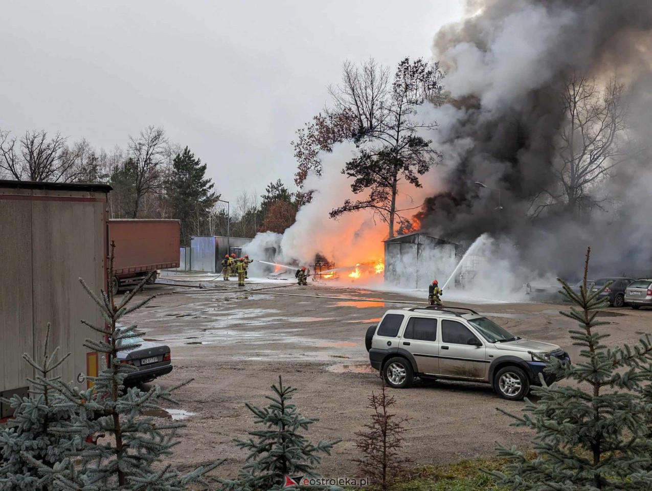 Pożar przy Ostrowskiej w Ostrołęce. Płoną garaże. Z ogniem walczy kilka jednostek strażackich.