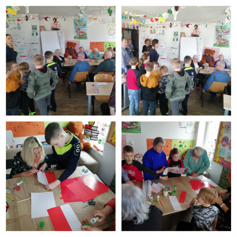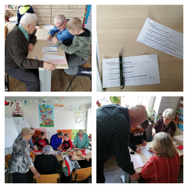 Spotkanie odbyło się z okazji zbliżającego się Święta Konstytucji 3 Maja. Na początku dzieci i seniorzy podzielili się na grupy złożone z jednego dziecka i dwóch seniorów. Następnie zadaniem grup było przechodzenie od stanowiska do stanowiska i wykonywanie poszczególnych zadań: