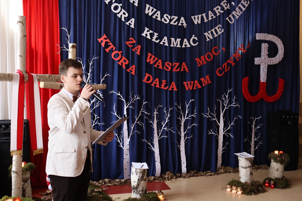 Po części oficjalnej uczniowie klasy IV, V i VIII zaprezentowali patriotyczną część artystyczną, której przewodnie hasło brzmiało:,,ZA WASZĄ WIARĘ, KTÓRA KŁAMAĆ NIE UMIE, ZA WASZĄ MOC, KTÓRA DAŁA WAM CZYNY...” Akademię przygotowały: Małgorzata Makowska i Agnieszka Stepnowska. Dekorację wykonała Katarzyna Mierzejewska.