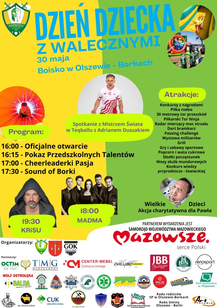 "Dzień Dziecka z Walecznymi" to świetna okazja do rodzinnego spędzenia czasu, aktywnej zabawy i integracji społeczności lokalnej. 30 maja nie może Was zabraknąć na boisku w Olszewie-Borkach – zapowiada się dzień pełen emocji, uśmiechu i niezapomnianych wspomnień!