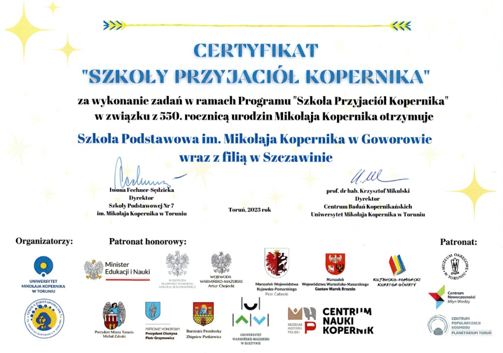 Szkoła Podstawowa im. Mikołaja Kopernika w Goworowie wraz z Filią w Szczawinie przystąpiła do programu "Szkoła Przyjaciół Kopernika". Organizatorem tego ogólnopolskiego przedsięwzięcia było Centrum Badań Kopernikańskich Uniwersytetu Mikołaja Kopernika w Toruniu oraz Szkoła Podstawowa nr 7 im. Mikołaja Kopernika w Toruniu pod honorowym patronatem Prezydenta Rzeczypospolitej Polskiej.