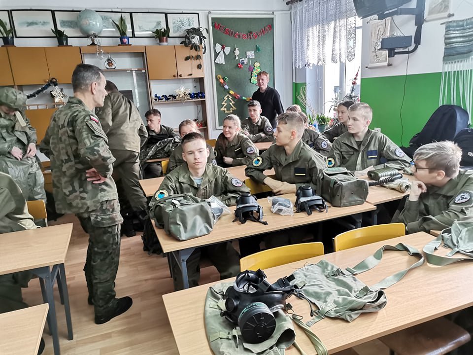 Zajęcia przeprowadzone na terenie szkoły rozpoczęły się meldunkiem i omówieniem warunków bezpieczeństwa przez ppor Mariusza Łapińskiego,