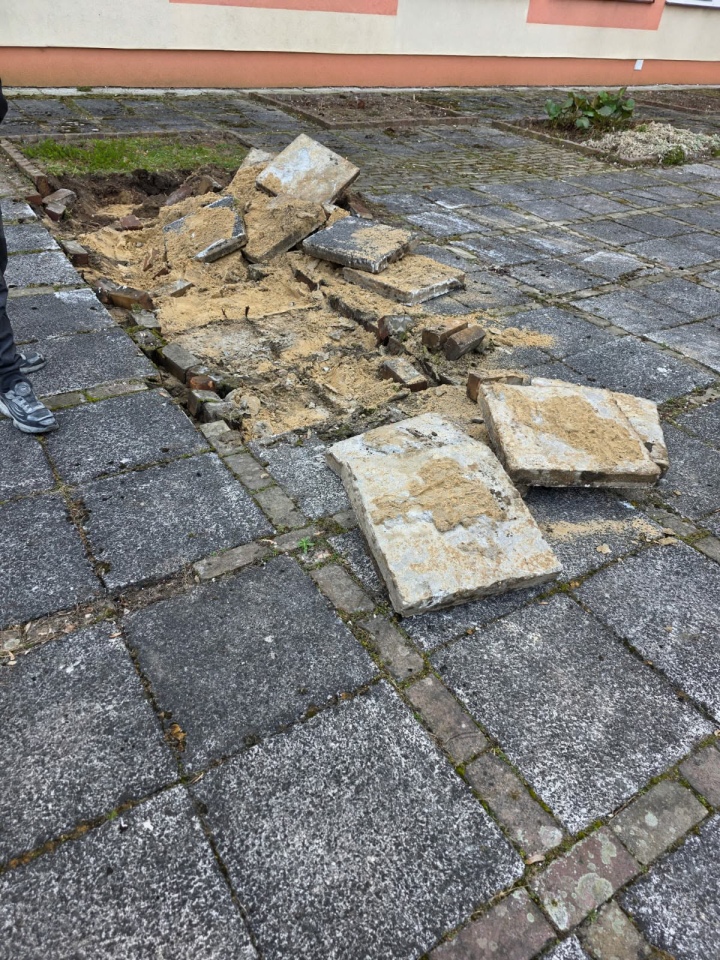 Teren zewnętrzny: Przeniesienie stojaka na rowery, odtworzenie utwardzenia z kostki brukowej (ok. 5,6 m2) oraz wykonanie nowej nawierzchni z kostki (ok. 5,9 m2).