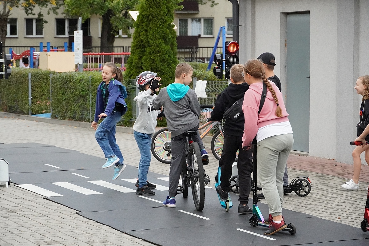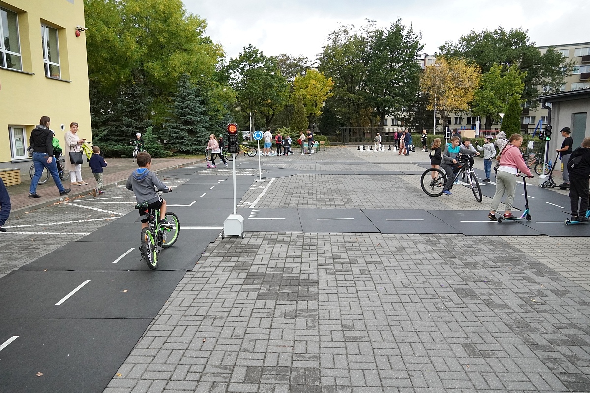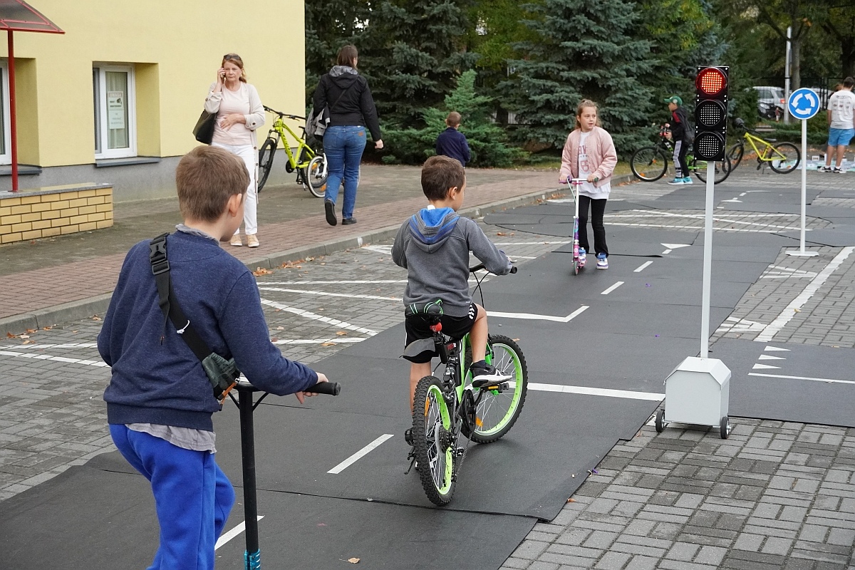 Wiele atrakcji sprawiło dzieciom mobilne miasteczko ruchu drogowego z sygnalizatorami i znakami drogowymi, na którym uczniowie mogli sprawdzić swoją wiedzę przydatną np. podczas egzaminu na kartę rowerową.
