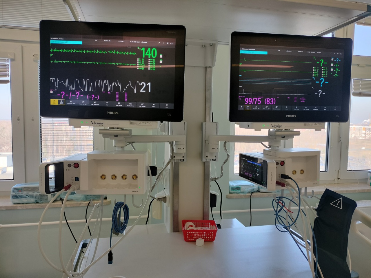- System monitorowania pacjentów - kardiomonitory (15 szt.) - służący do monitorowania EKG, ciśnienia krwi, częstości oddechów i innych parametrów u pacjentów kardiologicznych.