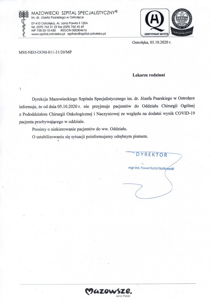 Dyrekcja Mazowieckiego Szpitala Specjalistycznego im. dr. Józefa Psarskiego w Ostrołęce informuje, że od dnia 05.10.2020 r. nie przyjmuje pacjentów do Oddziału Chirurgii Ogólnej z Pododdziałem Chirurgii Onkologicznej i Naczyniowej ze względu na dodatni wynik COVID-19 pacjenta przebywającego w oddziale. Prosimy o niekierowanie pacjentów do ww. Oddziału. O ustabilizowaniu się sytuacji poinformujemy odrębnym pismem
