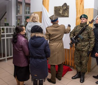 fot. Starostwo Powiatowe w OstrołęceTablicę odsłonili bliscy, w tym żona Iwona, mama Zofia, brat Dariusz. Zanim się to stało, zebrani wzięli udział we mszy św. w bazylice. Potem przeszli przez Myszyniec, prowadzeni przez orkiestrę wojskową. Pod szkołą żołnierze 15. Giżyckiej Brygady Zmechanizowanej im. Zawiszy Czarnego oddali cześć poległemu koledze, wciągając polską flagę na maszt. Potem została odsłonięta tablica. Goście, w tym wojskowi z kilku brygad, zostali zaproszeni do sali.